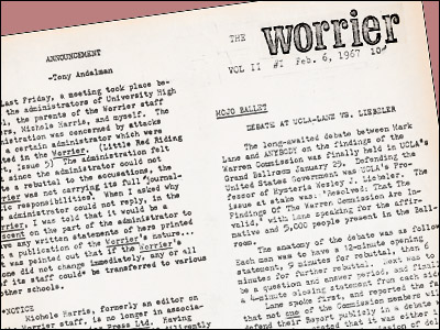 A lot of my memories of University High School involve campus unrest, protests and the odd hills some people chose to die on. The same would be true in my didn't-stick-around-long-enough-to-graduate days at U.C.L.A. but this is about my time at Uni. Some of those tumultuous times involved a little underground newspaper called The Worrier. The official school newspaper at Uni was called The Warrior but a tiny cabal of students got together and published a cheaply-printed counter-argument to it called The Worrier.