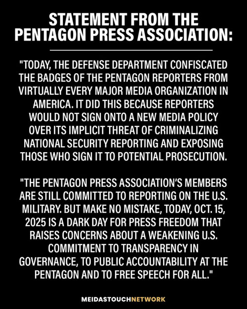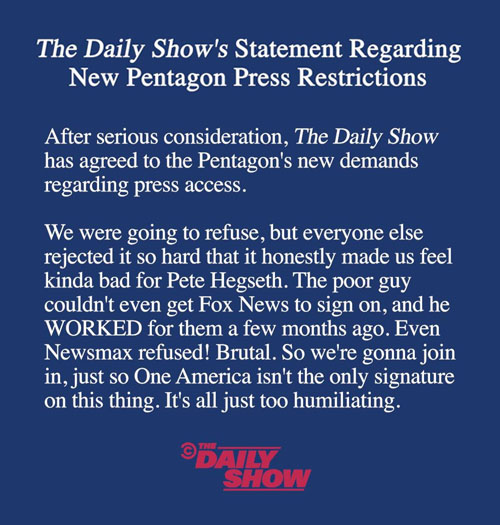 One of the recent outrages was Pete Hegseth — our Secretary of Defense or War or Whatever The Hell He Is — trying to decree what the press can write about matters under his jurisdiction and what they cannot. It's about as unAmerican as anything anyone in our nation's history has ever done so I was glad to see this statement today…